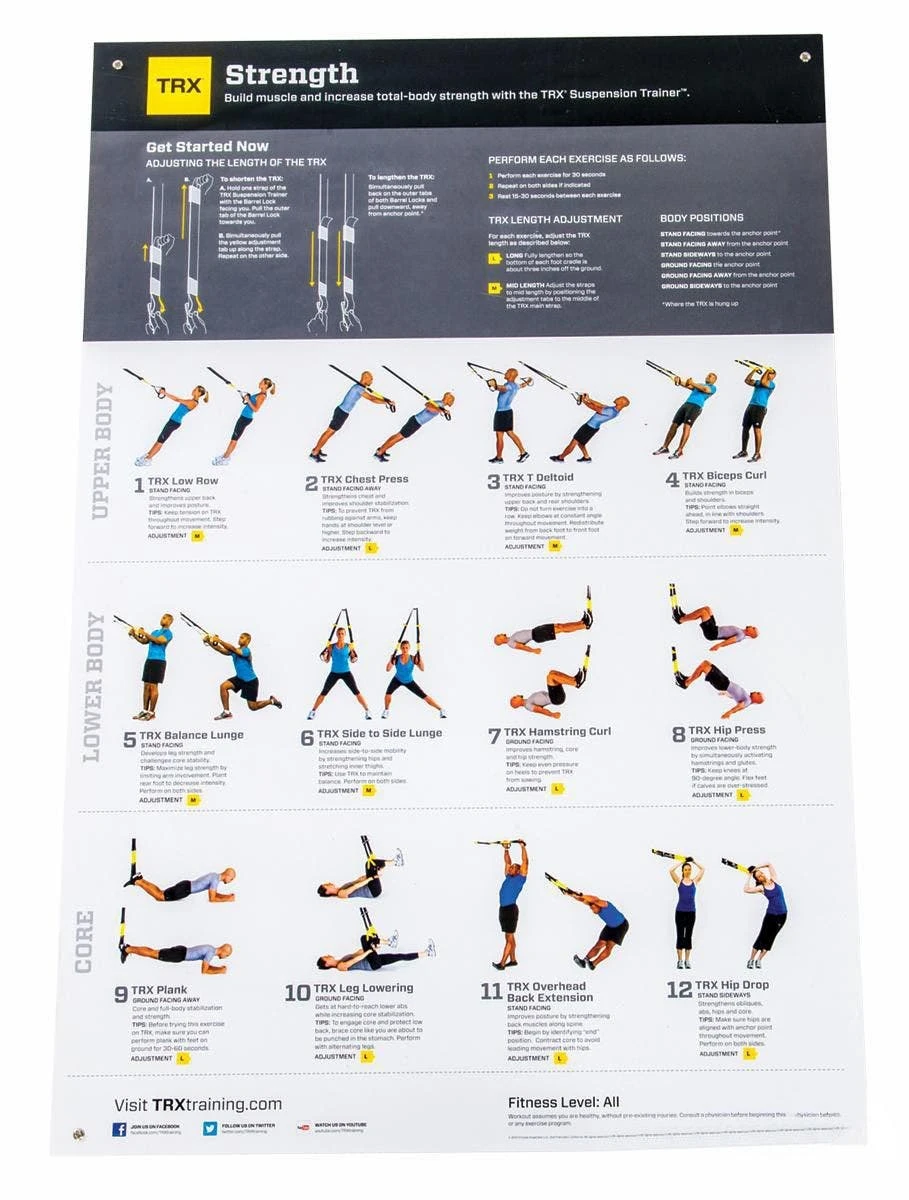 Anyone can participate in TRX bodyweight training with a poster that shows you the ropes. The TRX All-Body Strength Poster walks users through 12 essential exercises to gain strength and power. Step-by-step instructions and vivid start and stop positions make it easy to follow along. Exercises cover upper body, lower body, and core muscle groups for a full workout. Laminated poster measures 24″W x 36″L. TRX trainer not included.