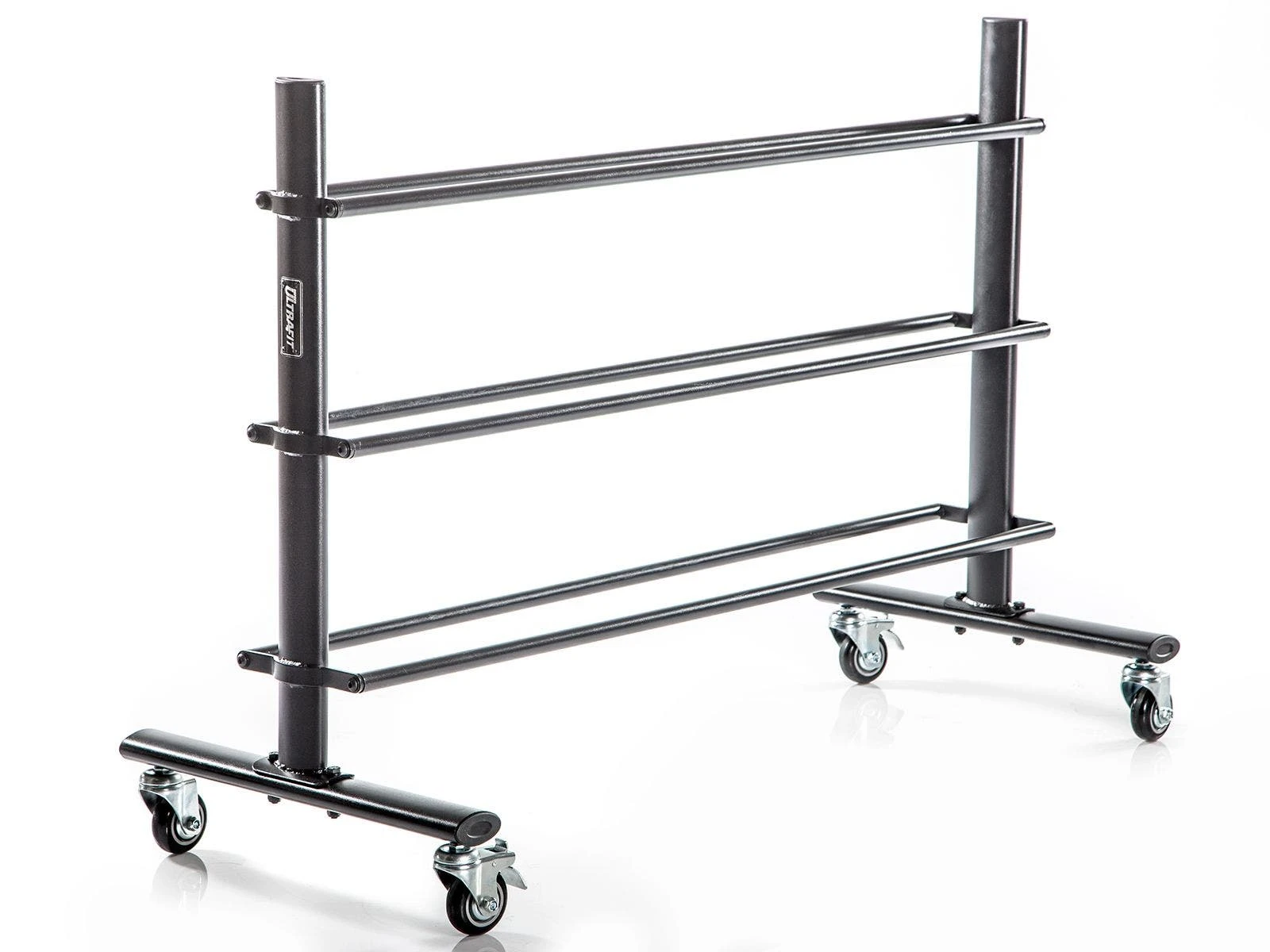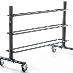 This rack holds 15 balls and offers a narrow profile for its capacity. Casters allow for easy rolling from room to room, or storage closet to gym. Fits through a standard, single doorway. Two locking casters ensure rack stays put.