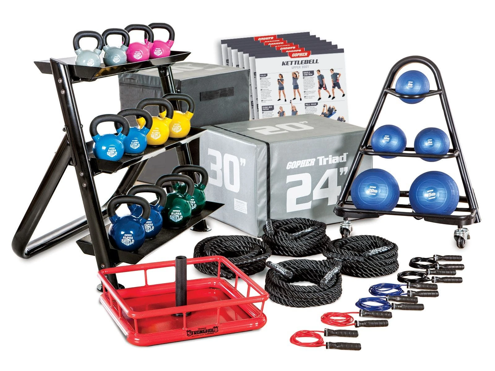 Included storage for kettlebells, slam balls, and ropes keep the multiple pieces organized and together when not in use. Laminated training charts guide students through each exercise for a total-body cross-training workout.