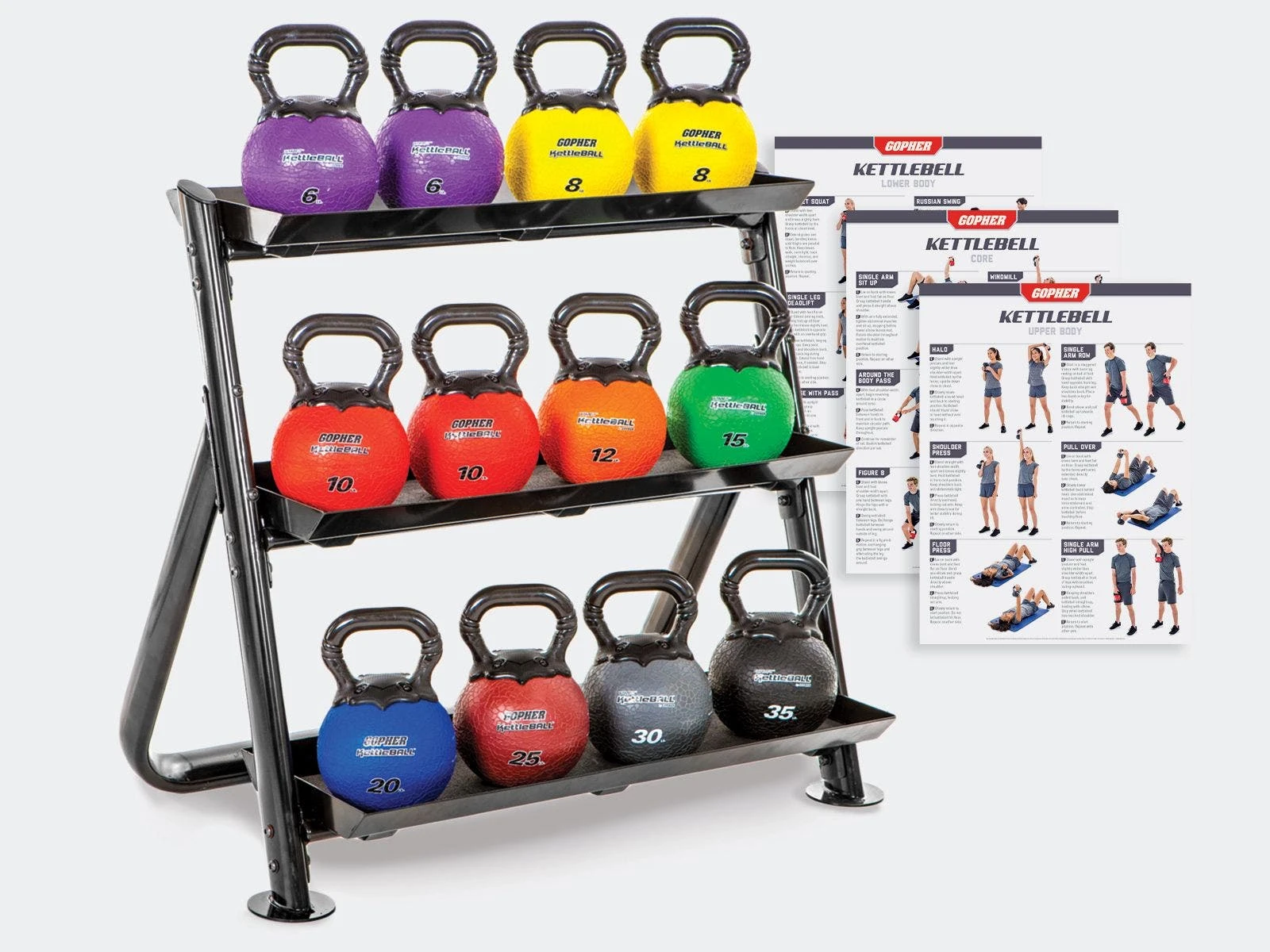 Designed for new users but with the same heft as cast-iron options, the included rubber kettlebells are perfect for intermediate lifters. With safety features built in, it’ll provide a great workout while encouraging good form and comfort.