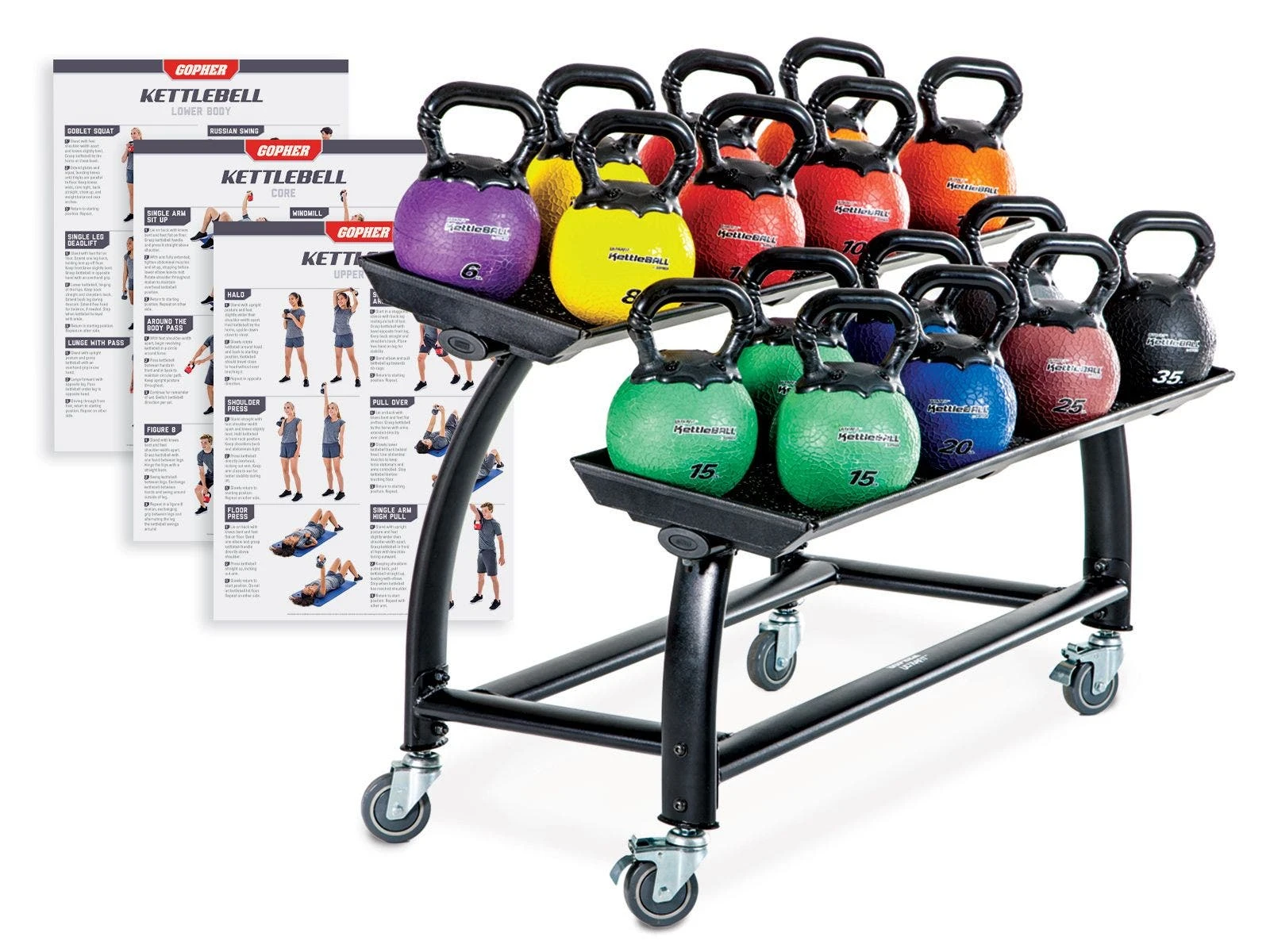 Sets of intermediate kettlebells include a stationary or mobile rack and instruction. This allows teachers to purchase a complete solution for their kettlebell training unit with matching equipment and storage.