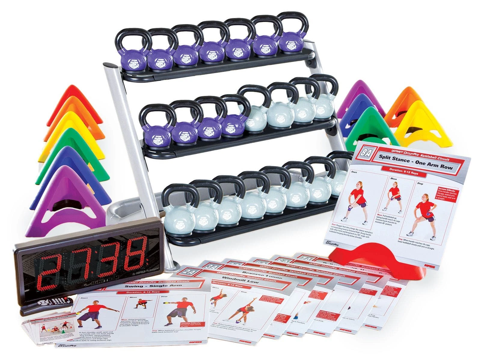 This ready-made pack includes all of the equipment teachers need to start kettlebell training right out of the box. Students select an 4 kg or 6 kg kettlebell from the convenient three-tier storage rack and turn to the 18″ x 18″ Station Boards to begin training. Each board features a unique kettlebell exercise, displaying instructions for the movement as well as large, clear photos of start and stop positions. Accompanying Teacher Overview Cards offer extra instruction for setup and implementation. Allow students to complete all 16 stations, or let them work for an allotted amount of time using the included interval timer. When students are done, kettlebells are easily wiped down and replaced on the ladder-style storage rack.