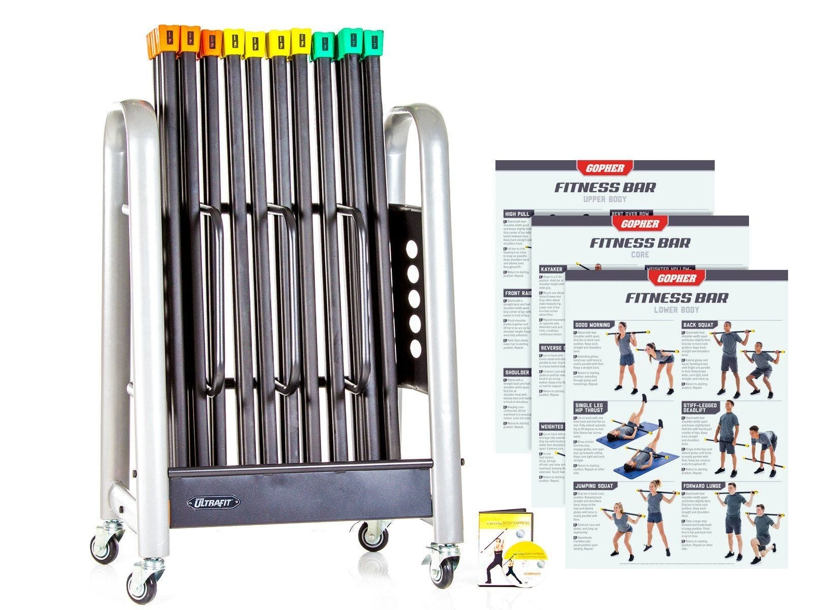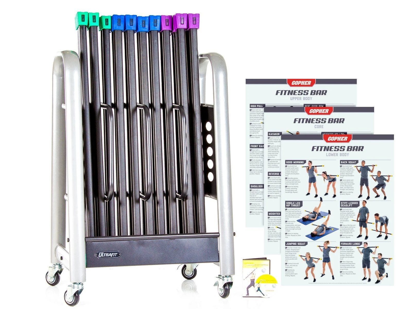 Convenient packs of 24 fitness bars include enough equipment for the entire class to participate in resistance-based aerobic exercise. On top of that, packs include training charts to guide students through 27 fundamental fitness bar exercises. Not only that, we raised the bar by including durable and mobile storage racks to make transportation and equipment storage easier than ever.
