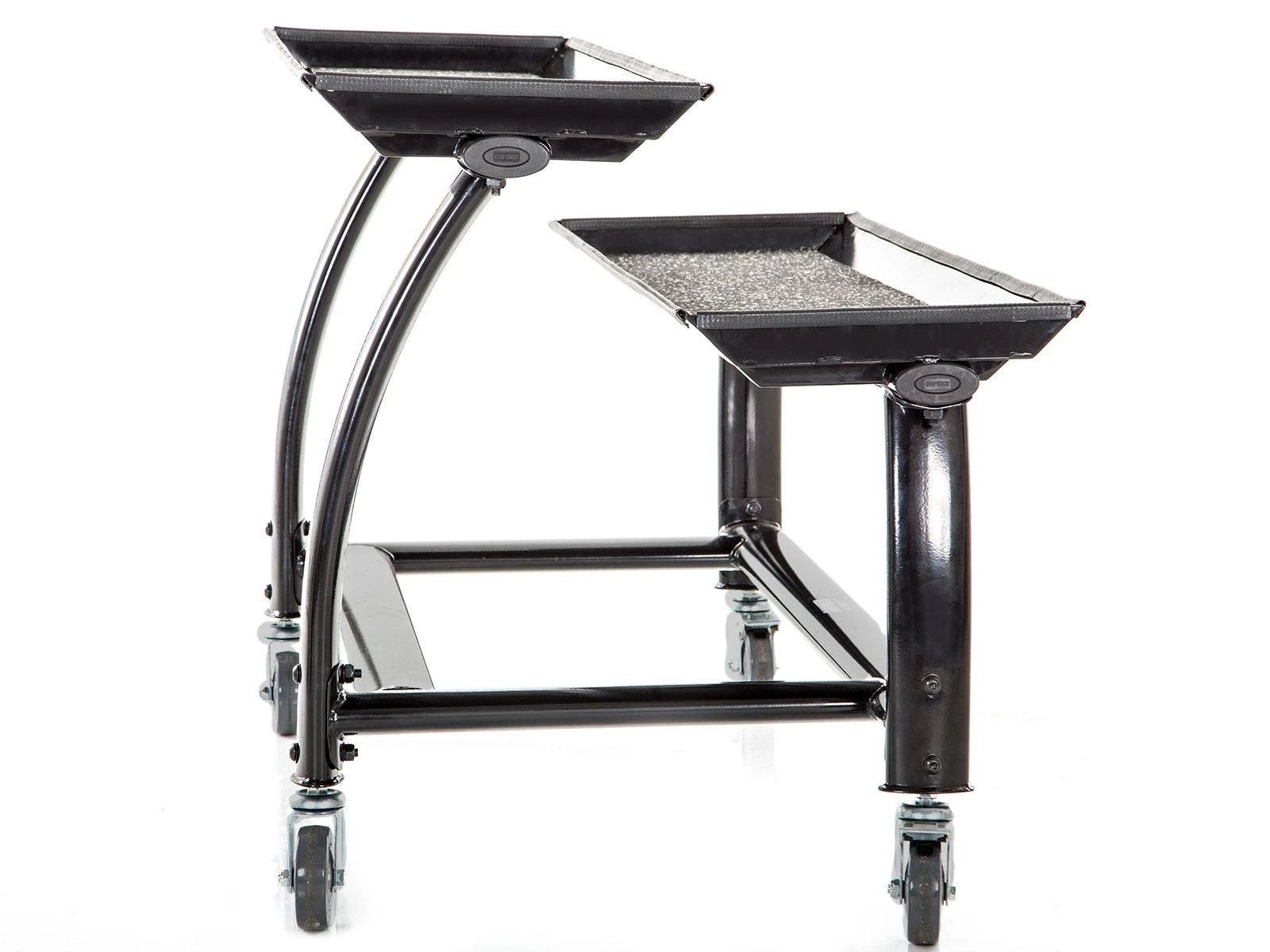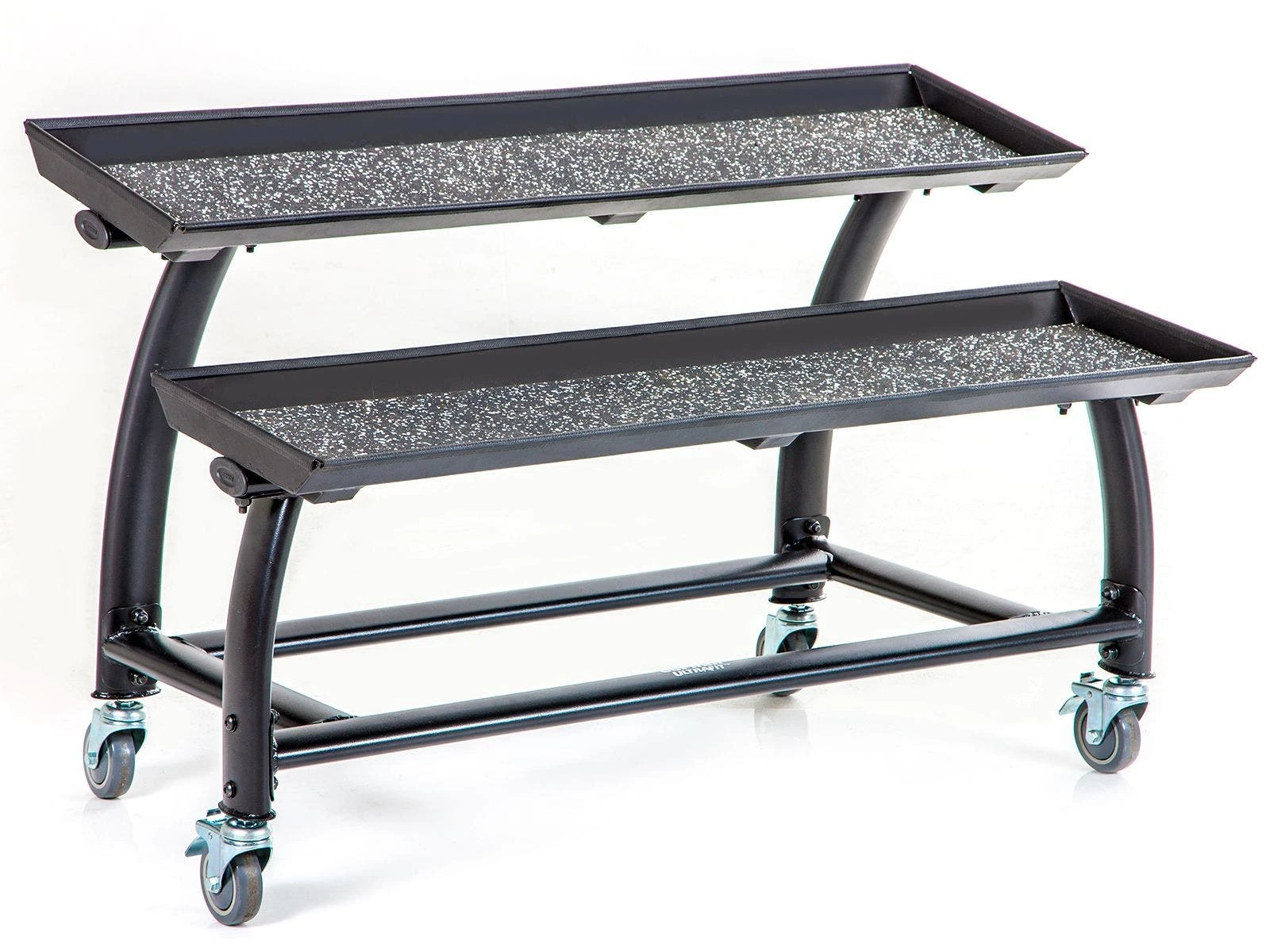 Designed for easy access and maximum stability. Heavy-gauge oval steel tubing is powder-coated for lasting use. Two trays with rubber bottoms keep kettlebells in place and provide easy access during training. Easily move the rack around the room and through doorways on the smooth-rolling casters. Simple assembly. Rack is 52″L x 30-1/2″W x 33″H; 136 lb.