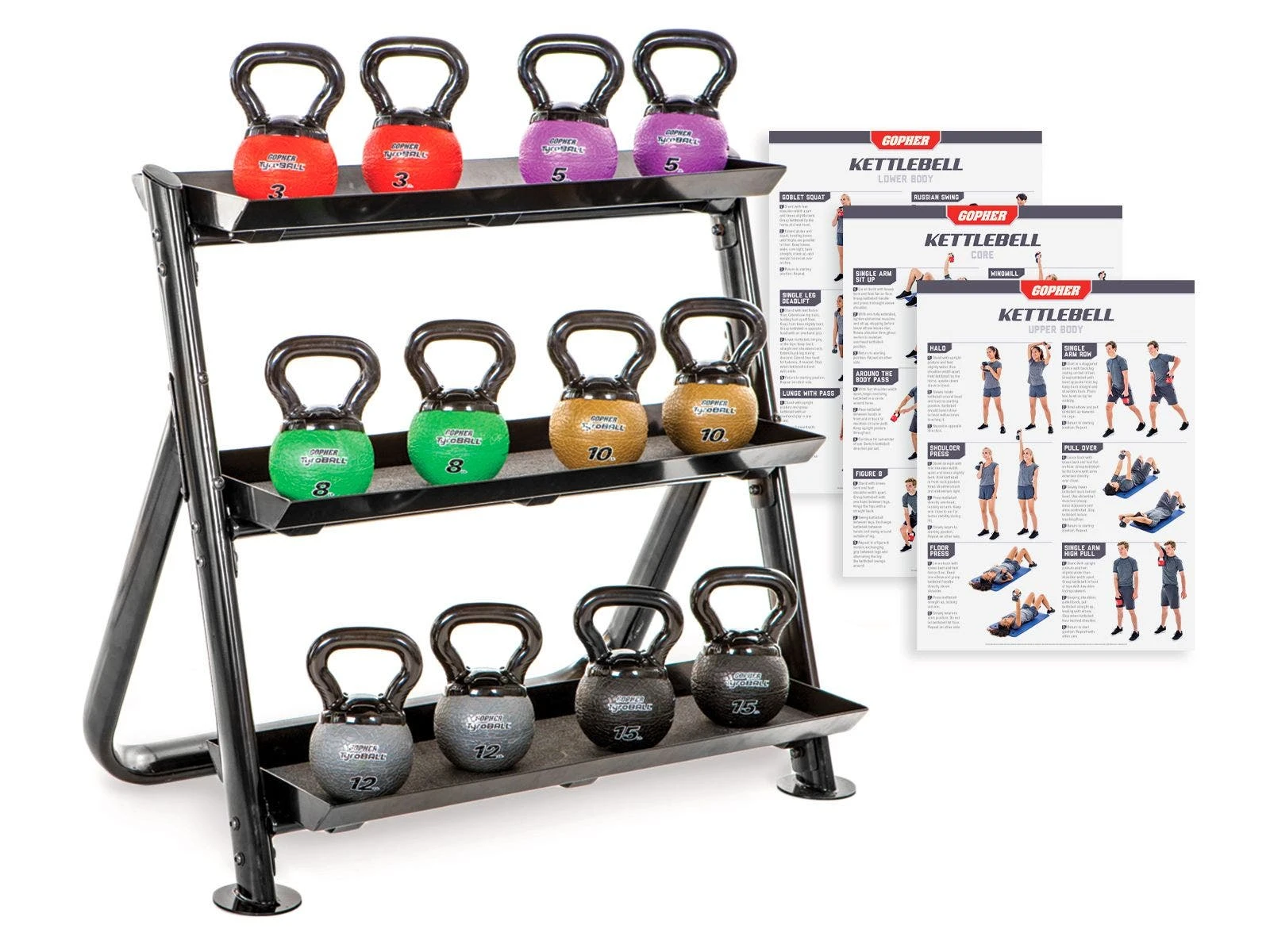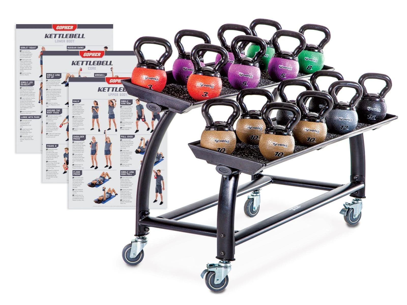 - Mobile Set. Includes 16 kettlebells (2 ea 3, 8, 12, 15 lb; 4 ea 5, 10 lb), mobile rack, and 3 training charts.